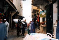フェズ・エル・バリ フェズのメディナの中で最も古く、世界遺産にも登録されている。 今も、フェズの人口の約半分、 30万人ほどの人々がここと、もう一つのメディナに住んでいるという。 幅2mか3mほどの狭い道が、何百にも枝分かれし、入り組んだ路地は、 メディナ 専用のガイドなくては迷子になる。 ツアーからはぐれたら、<動かずにその場所で 待っていて>と添乗員さんに言われる。 ロバや荷車が通ると、観光客は皆、壁にはりついて道をあける。 ”バラック、バラック”(気をつけて)という言葉が飛び交っていた。 |