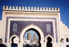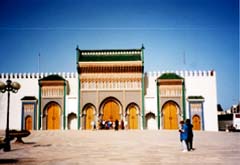13世紀から15世紀の、マリーン朝の王宮だったが、 今は、モロッコの王様が、フェズに滞在する時に使われる。 扉の金は、細かい細工がすばらしく、太陽にまぶしかった。 |