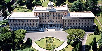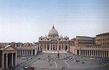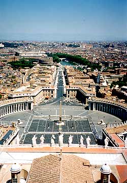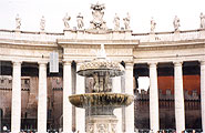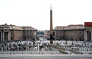 25.5mのオベリスクがたっている。 これは、日時計としての役目も果たしてきた。 また、大聖堂に向かって左には、この地の名の由来でもある、 ペテロの像がある。ペテロは鍵をもっているが、 これは、キリストが天国をあける鍵をペテロに与えたことによっている。 向かって右は、パウロの像。 今も、ここでは、ミサが開かれ 毎週日曜の正午には、ヴァチカン宮殿の窓に、 また、キリストの祝祭日には、サン・ピエトロ寺院のバルコニーに法王が現れ、信者に祝福をあたえてくれる。 毎週水曜には、一般謁見があるが、これはヴァチカン市国に直接申請して席をもらえば参加できる。 |