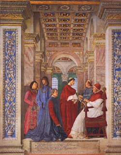 玉座のシクストゥス4世と、前にひざまずく初代館長のバルトロメオ・プラティーナ。 この絵はもともと壁に描かれていたものを、後にキャンバスに移した。 また、後にユリウス2世になる人物を描かれている。